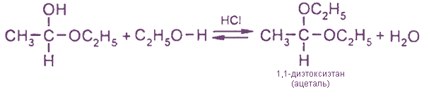 В избытке спирта в присутствии HCl полуацетали превращаются в ацетали: