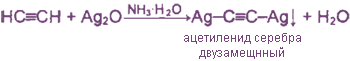 Образуются нерастворимые соли - ацетилениды. Возможны только для алкинов, содержащих этинильную группу -С=СН (т. н. терминальные алкины).