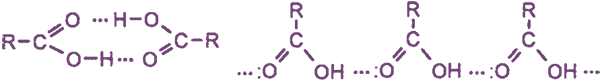 Температуры кипения кислот значительно выше температур кипения спиртов и альдегидов с тем же числом атомов углерода, что объясняется образованием циклических и линейных ассоциатов между молекулами кислот за счет водородных связей: